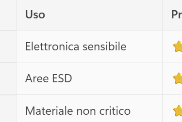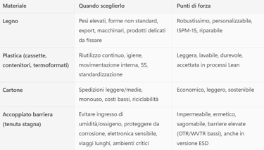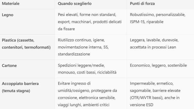 Ecco una tabella per guidarti alla scelta dei materiali: